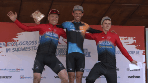 Dann ging es ganz schnell. Die Siegerehrung folgte so schnell dass kaum Zeit blieb für trockene Sachen. Was bei den anderen Klassen zwei Rennen brauchte, nämlich Ergebnisse festzustellen, ging da plötzlich holterdipolter. Wie, es sind alle da? Dann rauf auf’s Treppchen! Wollte da wer fertig werden und nach Hause? Die Vergabe der Führungstrikots erfolgte da fast schon im stillen Kämmerlein. Es war ja das erste Rennen des Elektroland24-Cyclocrosscups, powered by Wahoo. Demnächst macht man in Herxheim weiter und wühlt sich durch die Sandbahn.